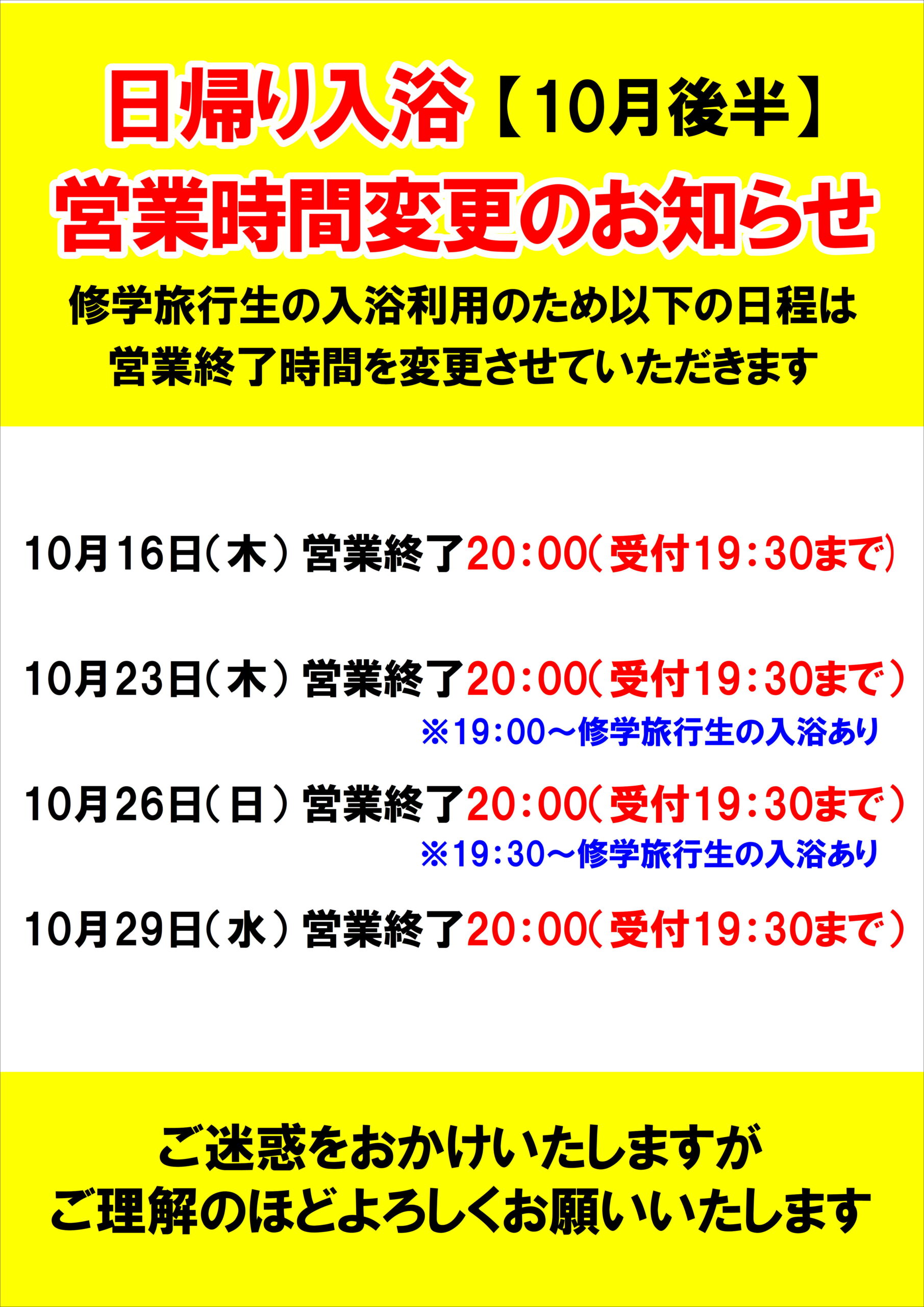 【10月後半】日帰り入浴営業時間変更のご案内 2025.10.12 修学旅行シーズンの日帰り入浴につきまして 下記の通り営業時間を変更させていただきます。 ご迷惑をおかけいたしますが、 何卒、ご理解のほどよろしくお願いいたします。 Post