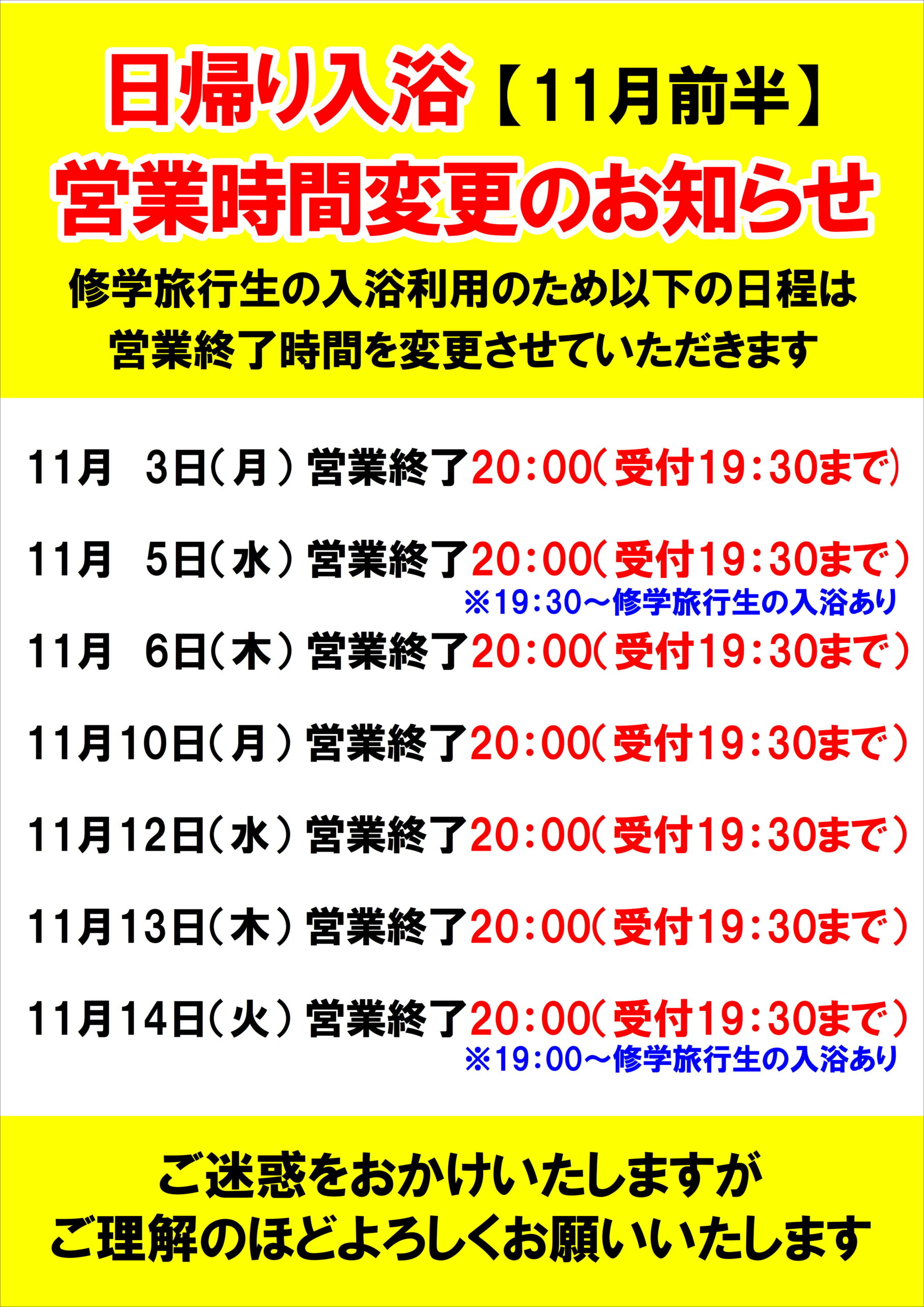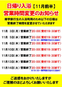 【11月前半】日帰り入浴営業時間変更のご案内 2025.10.30 修学旅行シーズンの日帰り入浴につきまして 下記の通り営業時間を変更させていただきます。 ご迷惑をおかけいたしますが、 何卒、ご理解のほどよろしくお願いいたします。 Post
